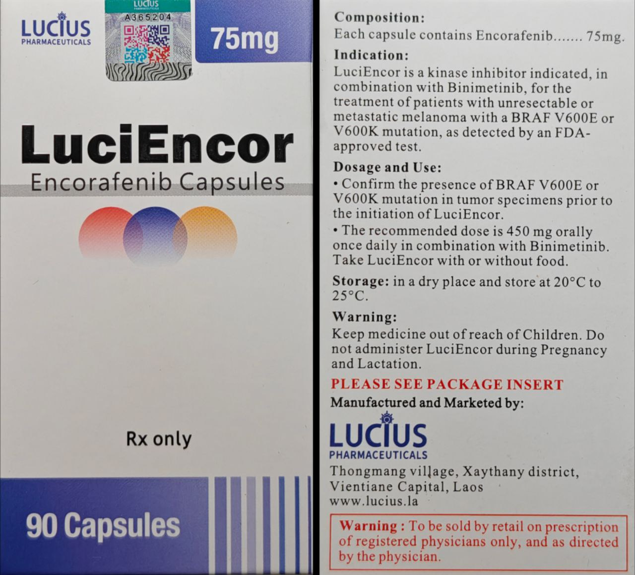 Енкорафеніб показаний у комбінації з бініметинібом для лікування дорослих пацієнтів з неоперабельною або метастатичною меланомою з мутацією BRAF V600E або V600K та метастатичним недрібноклітинним раком легені (НМРЛ) з мутацією BRAF V600E. Він також показаний у комбінації з цетуксимабом для лікування дорослих пацієнтів із метастатичним колоректальним раком із мутацією BRAF V600E.5